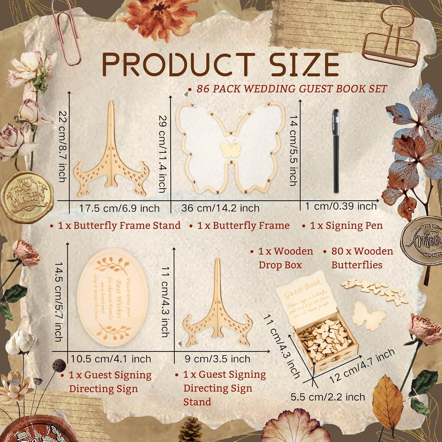 Specification: Wedding Guest Book Alternative Wooden Guest Sign in Butterfly Frame for Wedding Baby Shower Ceremony Party Reception Decors Butterfly Guestbook Sign with Drop Box 80pcs Leaves Directing Table Sign PenMaterial: Wooden, AcrylicSize: As the PicturesColor: Wood ColorPackage Include: (86pcs Wedding Guest Book Sign Accessories)1 x Wedding Guest Book Butterfly Frame 1 x Wedding Guest Book Butterfly Frame Stand1 x Guest Signing Directing Table Sign1 x Guest Signing Directing Table Sign Stand1 x Signing Pen1 x Wooden Drop Box80 x Butterfly Signing Pieces