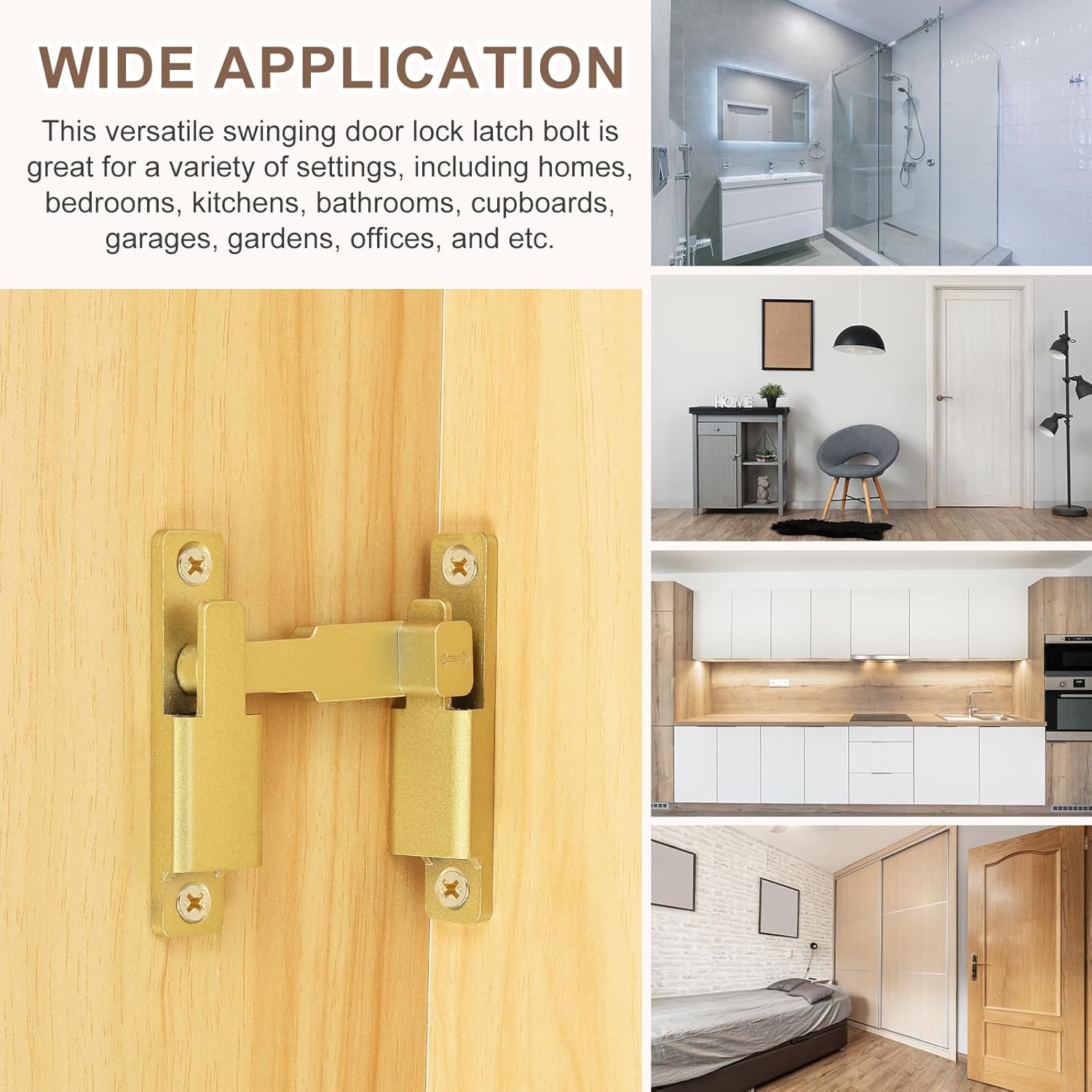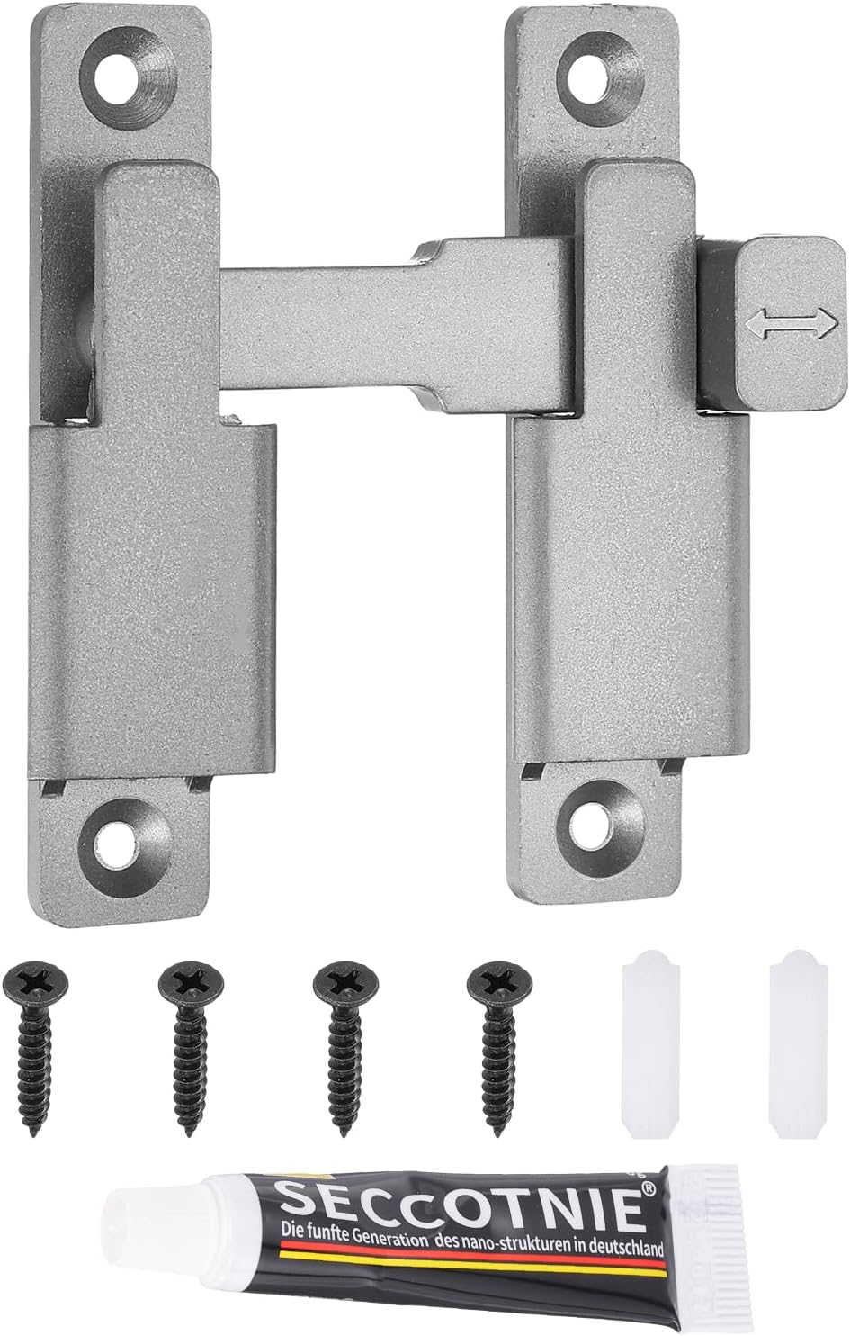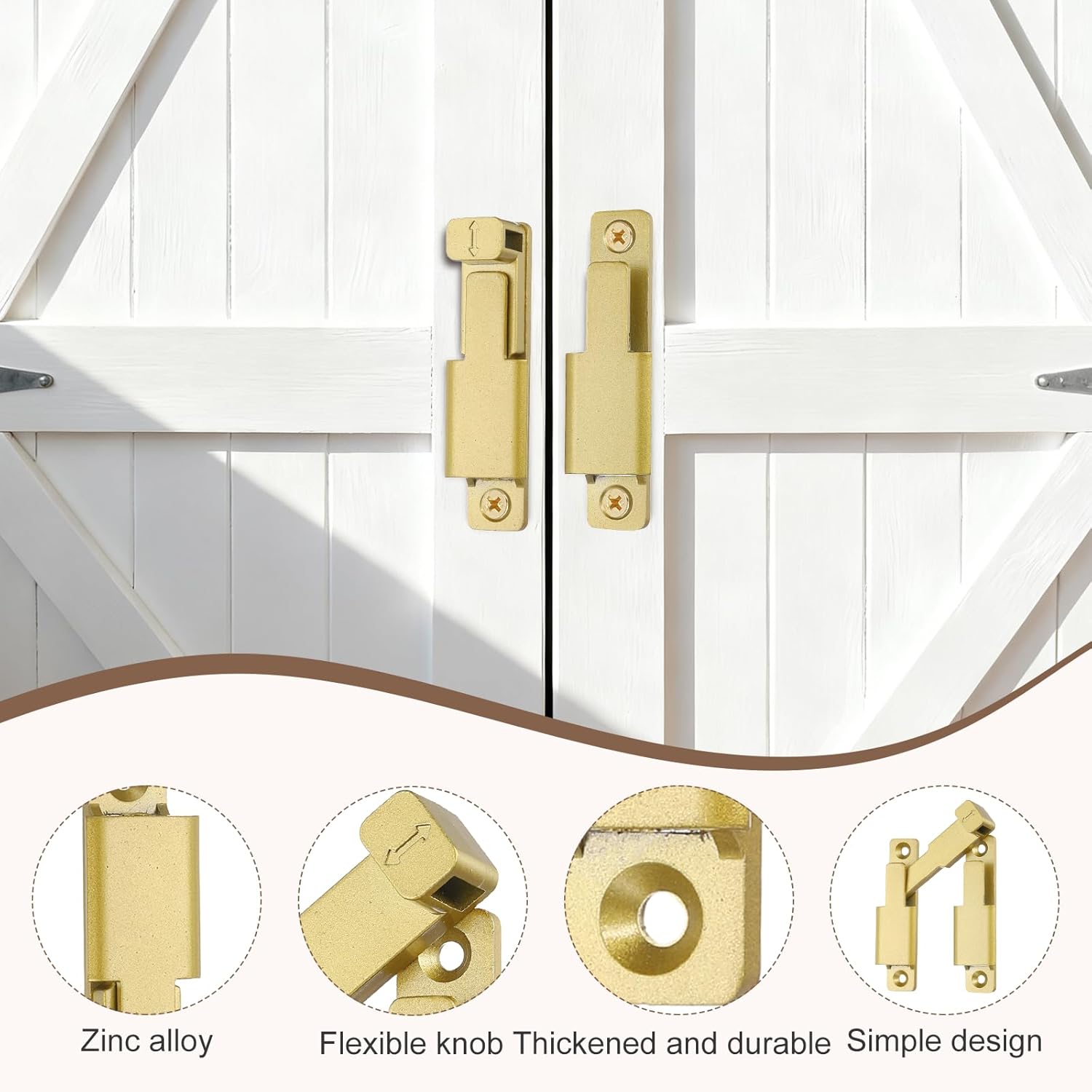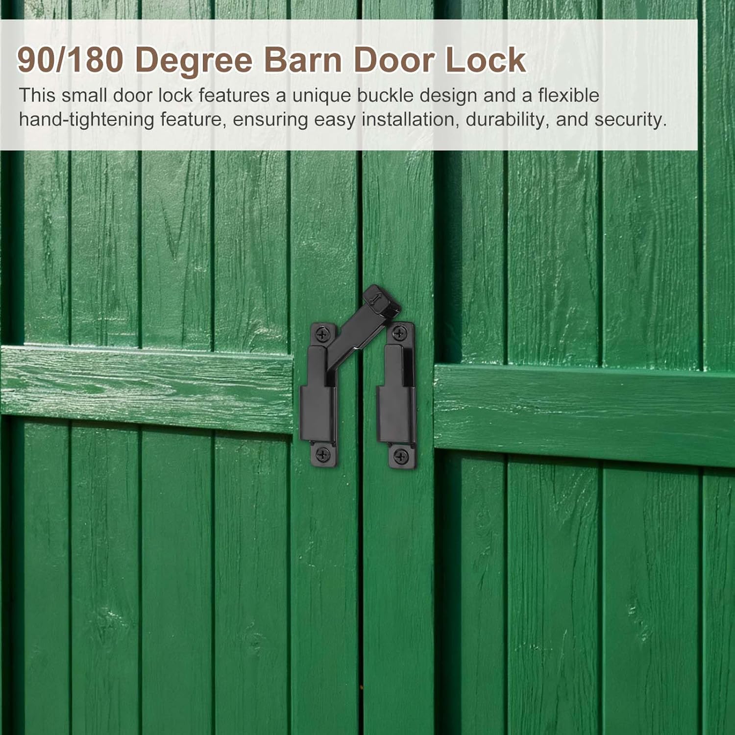 【Safe & Durable】:Material: Zinc Alloy; Size: 80 x 68 x 3.8mm / 3.15 x 2.68 x 0.15 inch; Hole Diameter: 4mm / 0.16 inch; Package Include: 1 x 90/180 degree barn door lock, 4 x screws, 2 x expansion tubes and 1 x glue. Constructed from robust solid zinc alloy, this sliding door latch lock is built to last. It features a multi-layer matte finish that resists daily scratches, corrosion, and discoloration, ensuring long-term durability and reliable performance in both indoor and outdoor environments.【Wide Application】:This versatile swinging door lock latch bolt is great for a variety of settings, including homes, bedrooms, kitchens, bathrooms, cupboards, garages, gardens, offices, and more. It is cooperates with most doors, good for enhancing security in bedrooms, balconies, windows, barn doors, and kitchen cabinets, ensuring the safety of your family.【Easy Install】:The sliding door lock is adaptable for both left and right installations and is easy to mount at 90° or 180° angles. Simply use the provided screws to attach the latch to your door or window frame at your chosen angle.【Meet Your Needs】:Specifically designed for all wooden doors, this small flip gate latches features a unique buckle design with flexible hand-tightening feature ensure easy installation, exceptional durability, and reliable security.Additionally, the 180 degree sliding door lock can be mounted at 90° right angles, also can be mounted at 180 degree angles for even more space-saving.【Use Tips】:Please check the dimensions before purchasing. Precise attention must be paid to the rotation card distance, as an incorrect distance may affect proper functionality.