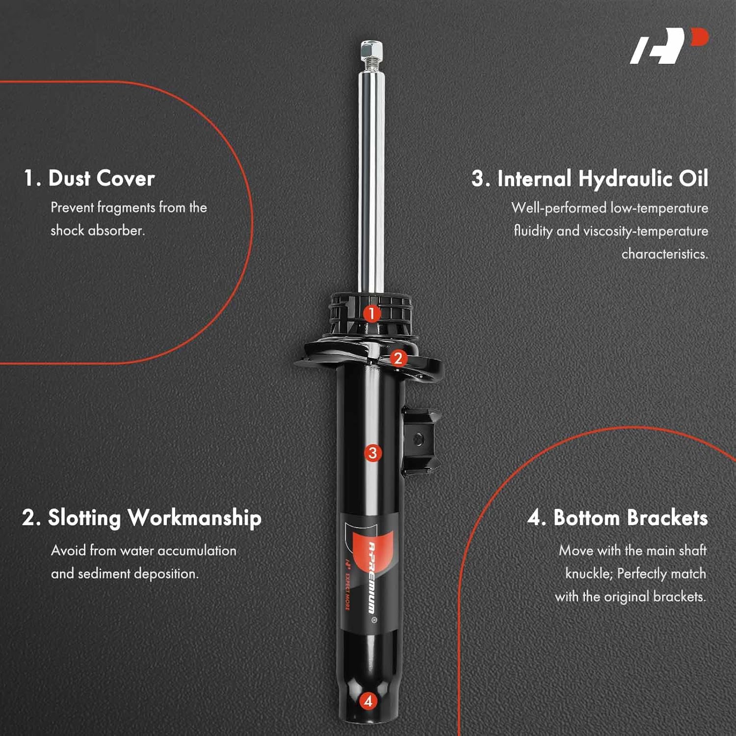 A-premium Shock Absorbers are an ideal choice to replace your broken Shock Absorbers. All Shock Absorbers meet or exceed OEM specifications. Due to high manufacturing standard, it will come with one year quality guarantee. Compatible with BMW Models: 2013-2014 320i 2012-2013 328i Sedan 2014-2014 328i Note: With Sport Suspension, with Standard Or Sport Suspension, without Electronic Damping Control 2014-2014 428i 2012-2013 335i Sedan 2014-2014 335i 2014-2014 435i Note: With Standard Or Sport Suspension, Sport Suspension without Electronic Damping Control 2015-2015 320i 2015-2015 328i 2015-2015 428i 2015-2015 328d 2015-2015 335i 2015-2015 435i Specifications: Fitment: Direct Replacement OEM Number: 742133SP, 315869, 22220080 Location: Front Left and Right (Driver and Passenger Side) Quantity Sold: A Set of Two Pieces