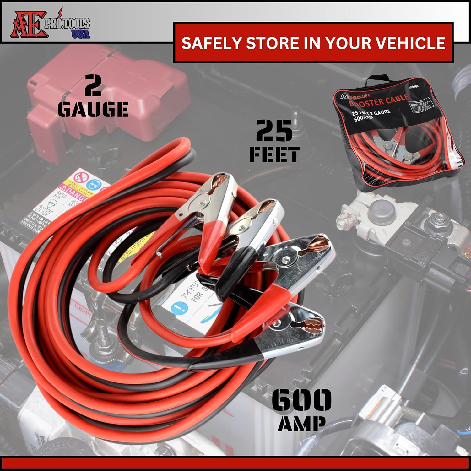 ATE Pro. Tools - Heavy Duty Jumper Cables 25' ft. 2 Gauge X-HD 600 AMP {PERFORMANCE} - Jumper Cables feature a 25' Foot Long Length, 2 Gauge and 600 AMP Design. These Commercial Automotive Vehicle Booster Cables are suitable for Motorcycle, Car, ATV, Truck and SUV. Reliable Insulation, for Ultimate Performance Under Extremely Low and High Temperatures. Cables will not Crack or Corrode. {CLAMP DESIGNS} - Tough and Safe Clamp Design. Industrial Grade Spring System, Secure Clamps on the Battery everytime. Heavy Duty Material Surrounds the Clamp, giving it long life and Rust Protection. Zipper Carrying Bag included. Easy to store in your vehicle or hang in your garage. ATE Pro. Tools providing Quality Tools and Accessories to the Professional and DIY Individual for over 25 Years.