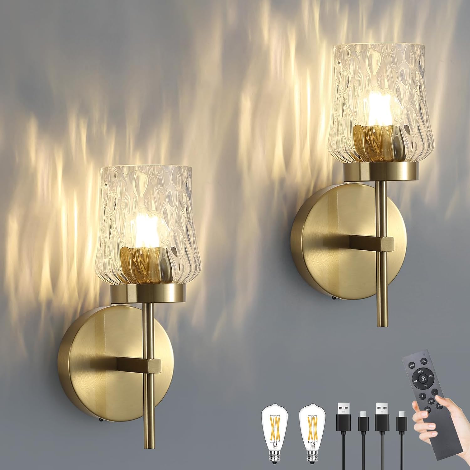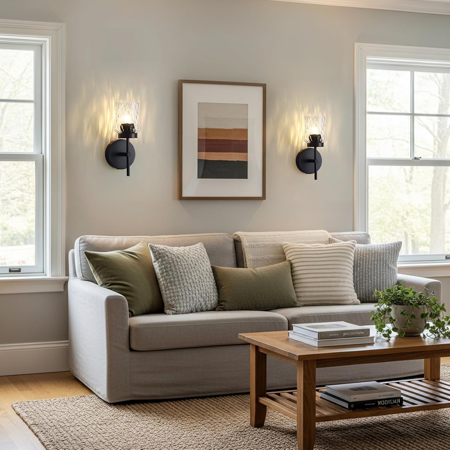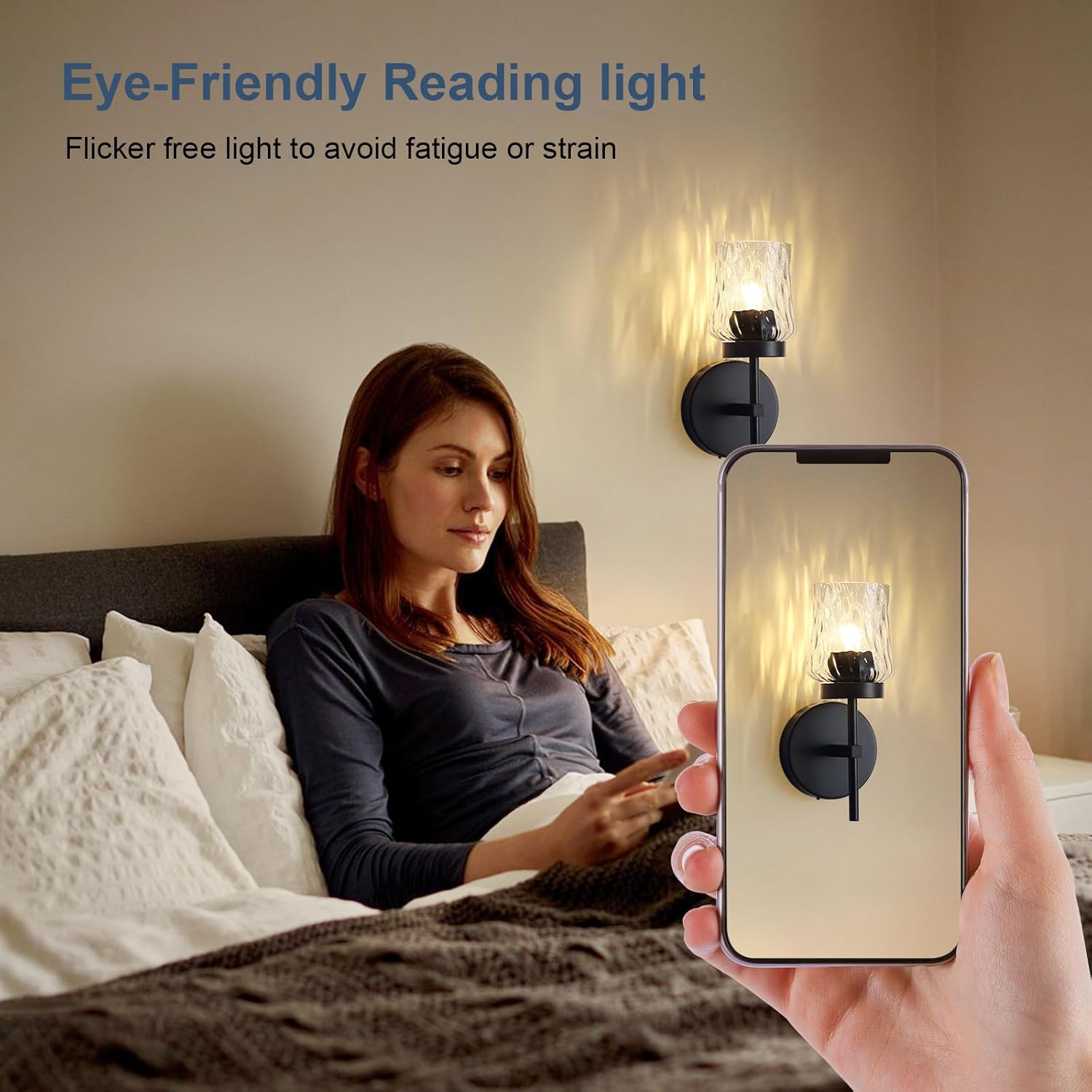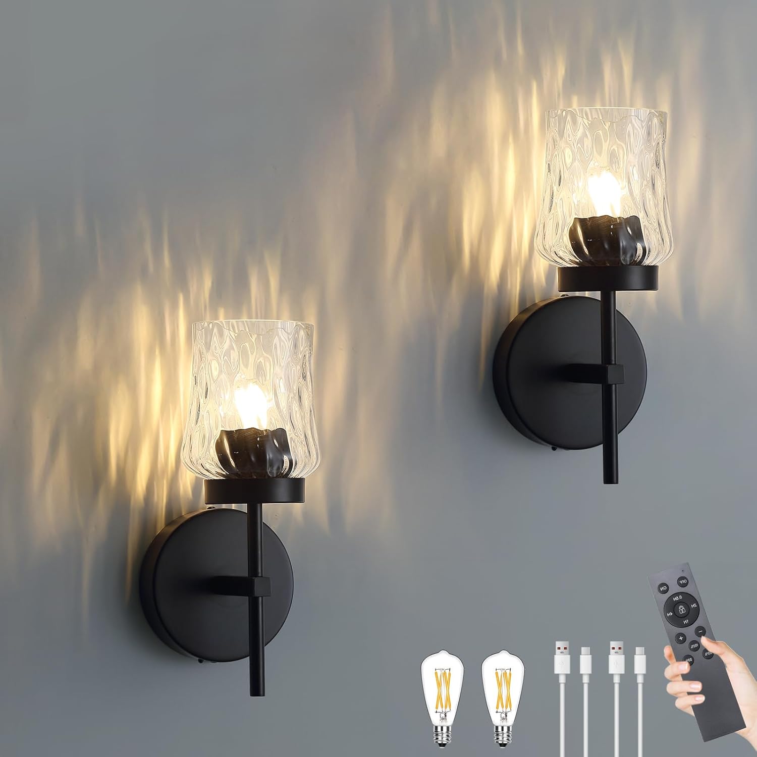 HONGREN Black Wall Sconces Set of Two Upward or Downward Hardwired Wall Light Fixtures with Wave Glass Modern Wall Lights for Living Room Bedroom Mirror Hallway (2 Pack)