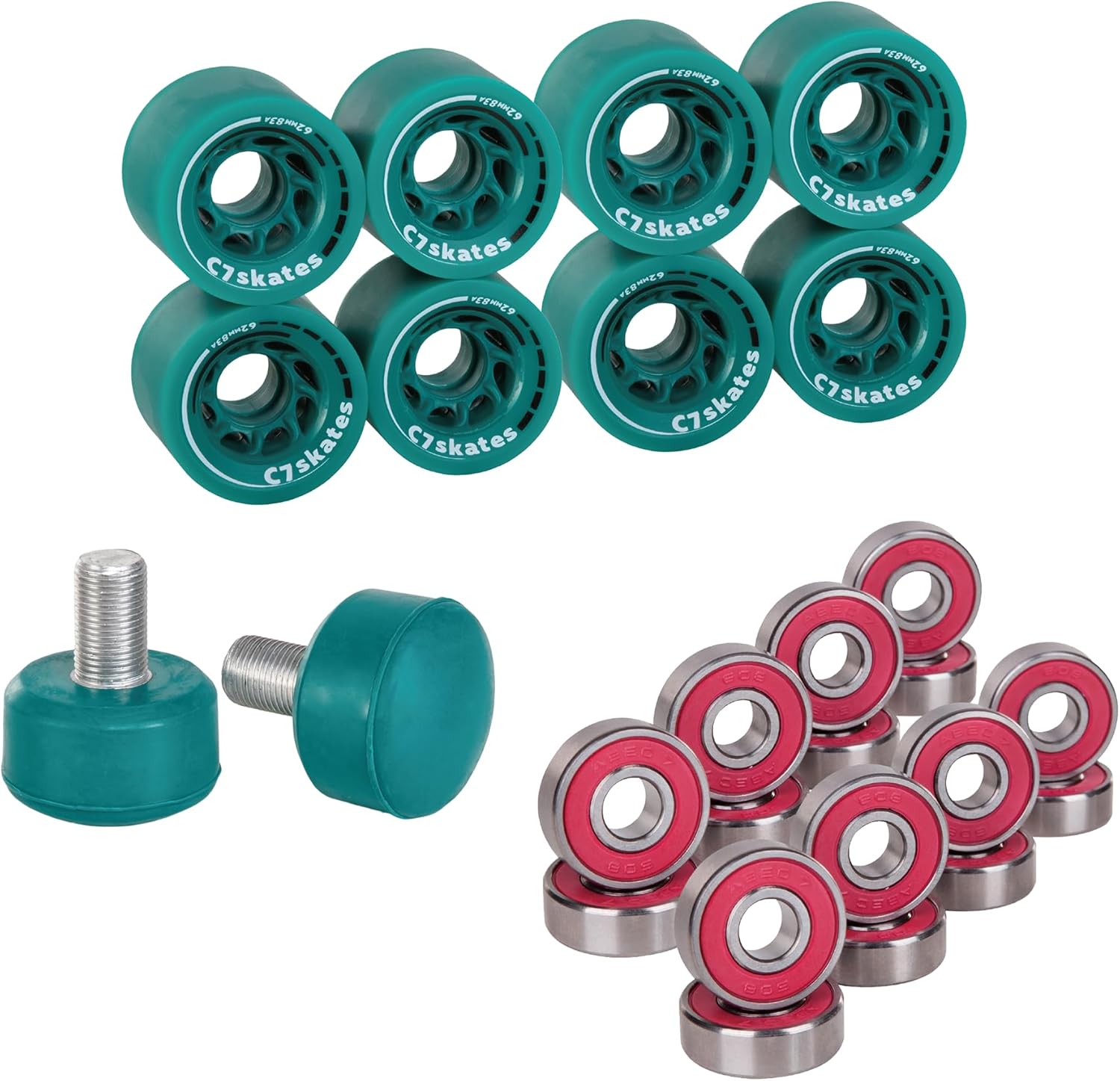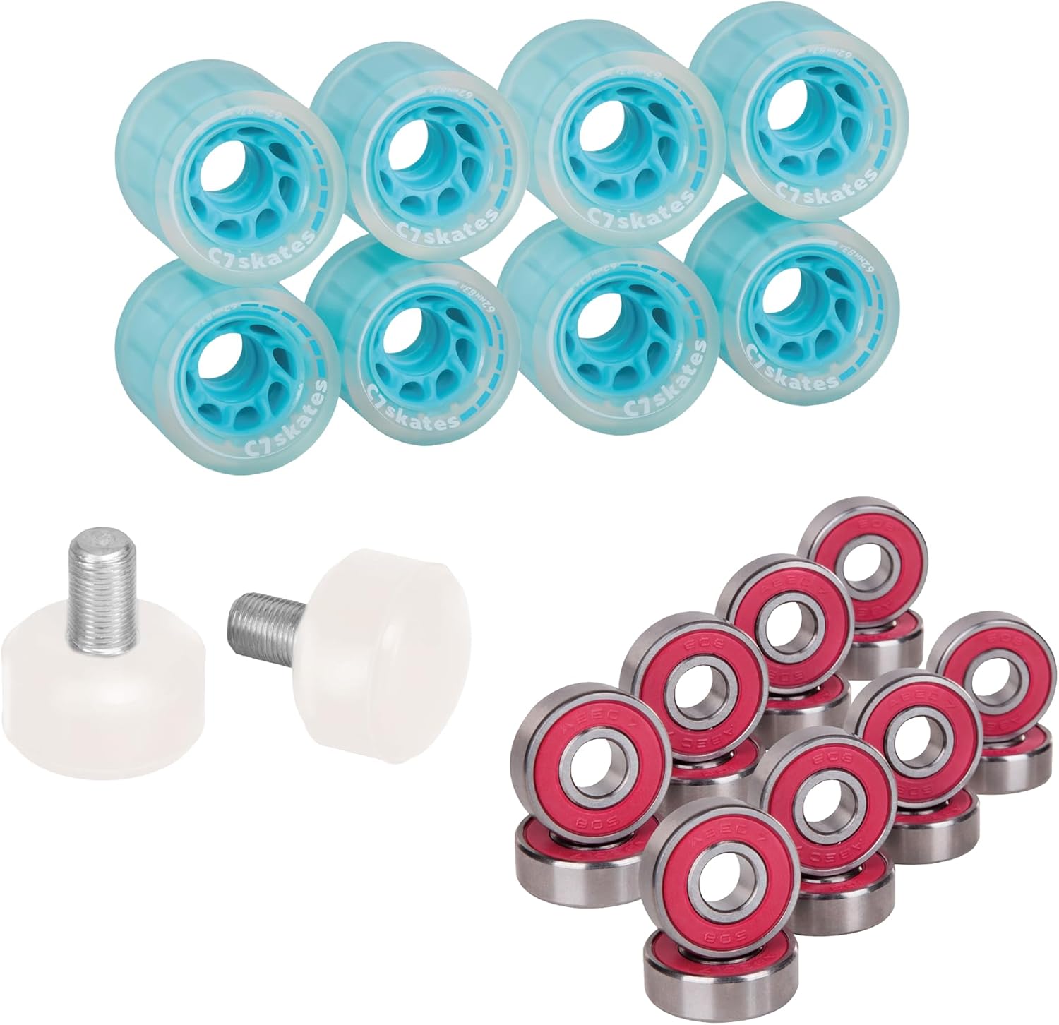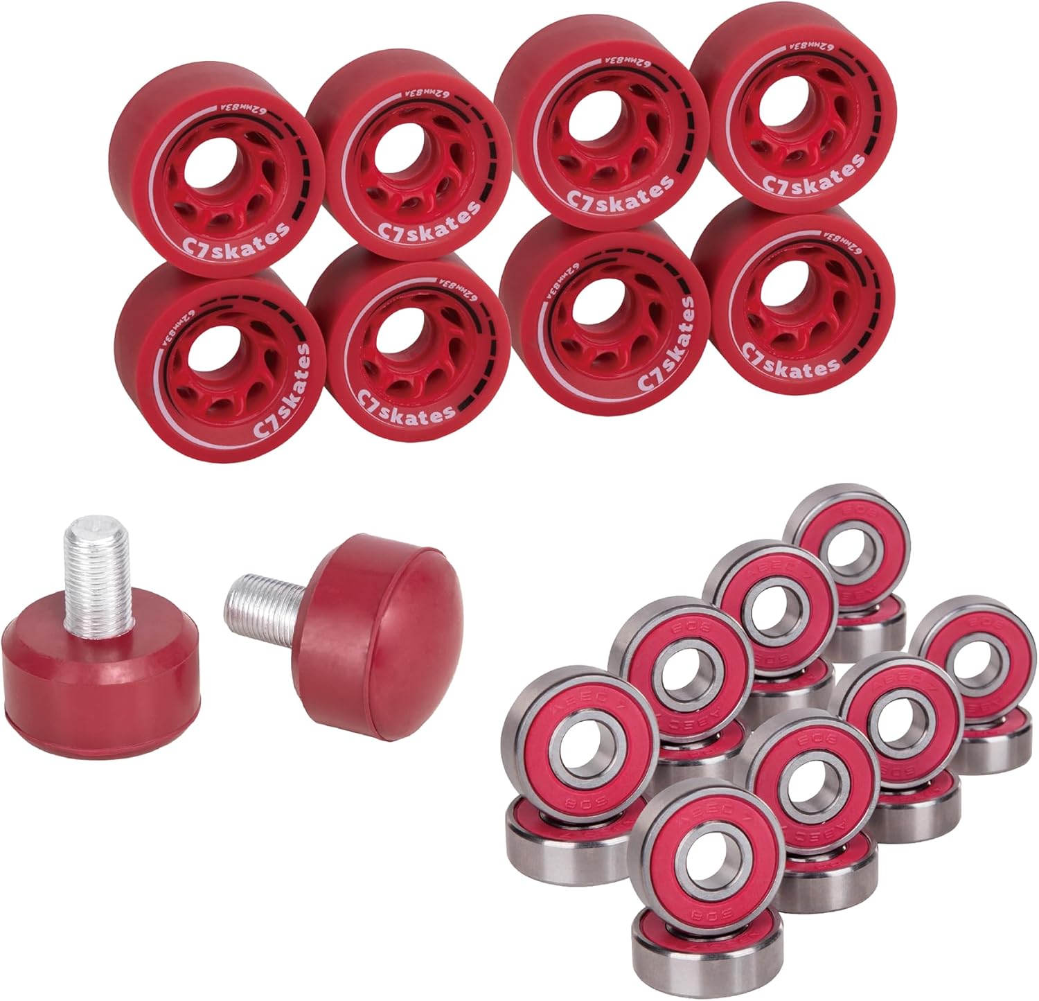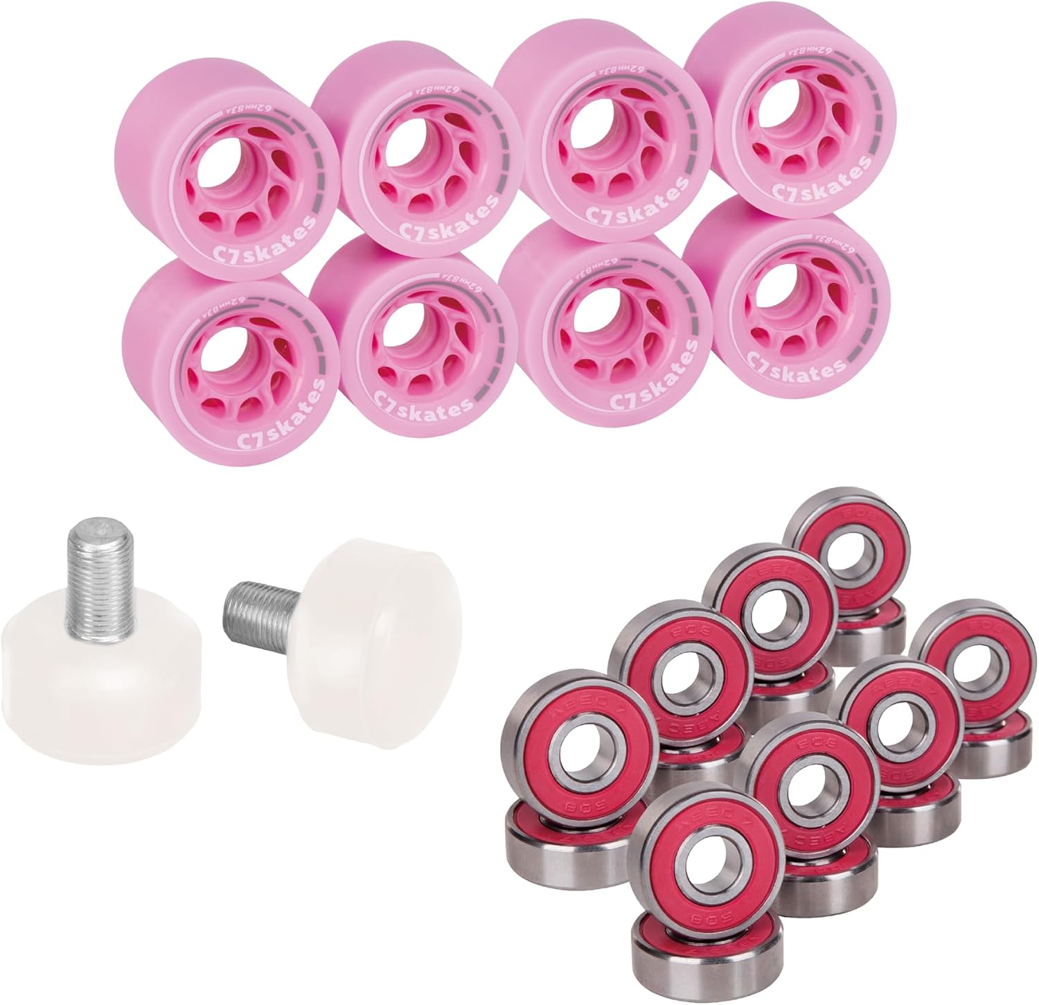 Transform your ride with the C7skates Roller Skate Wheels and Stoppers Combo, the ultimate refresh kit for your skates. This all-in-one set includes eight 62 mm x 34 mm wheels with a smooth-rolling 83A durometer, delivering the perfect balance of grip and glide whether you're cruising indoors or carving up the pavement. Two 47 x 35 mm responsive stoppers give you confident control when it’s time to brake or pivot. The combo also comes with two sets of ABEC-7 pre-lubricated bearings in red, yellow, or blue, shipped at random, for that effortless roll and touch of surprise. Whether you're upgrading worn-out gear or building a custom setup, this combo brings fresh energy, control, and style to every skate session.