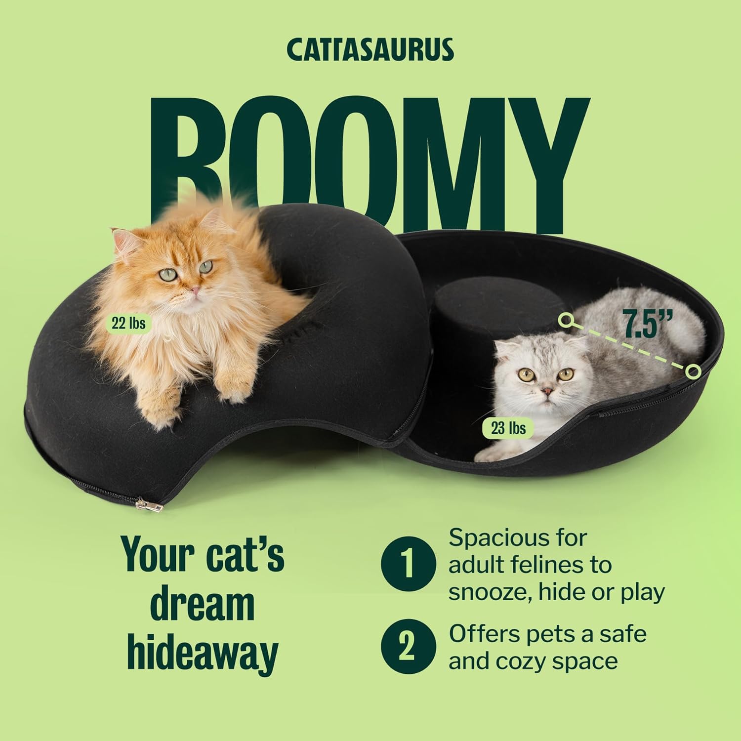 Treat your furry friend to the ultimate blend of comfort, play, and style with the Cattasaurus Peekaboo Cat Cave. Designed for multiple and large cats up to 30–45 lbs, this 3-in-1 self-warming cat bed, tunnel, and scratcher offers everything your indoor cat needs for rest and enrichment. Made from eco-conscious premium felt, the bed provides natural insulation and sound-proofing, creating a cozy, self-warming environment that supports deeper, more restorative sleep. The roomy tunnel structure doubles as a soft cat scratcher, protecting your furniture while keeping claws healthy. A peekaboo window on top adds an interactive touch, encouraging hide-and-seek and bonding play. Specifically built for cat beds for indoor cats and suitable for small dogs too, this multifunctional design is perfect for multi-pet homes. The bottom tunnel detaches for easy cleaning, just vacuum or hand wash and air dry. With its neutral tones and sleek, space-saving look, the Cattasaurus Peekaboo Cat Cave blends seamlessly into any home. From modern cat tunnels for indoor cats to a comfy donut cat bed, every detail is designed to make life with cats simpler and happier. Cattasaurus Peekaboo Cat Cave, Cat Donut Tunnel Bed, Cat Tunnel Bed, Peekaboo Cat Cave, Large Cat Cave, Large Peekaboo Cat Cave, Cattasaurus Peekaboo Cat Cave, Peek a boo cat cave, Cat Donut Tunnel, Cat Tunnel Bed, Cat Donut, Cat Cave, Cat Tunnel