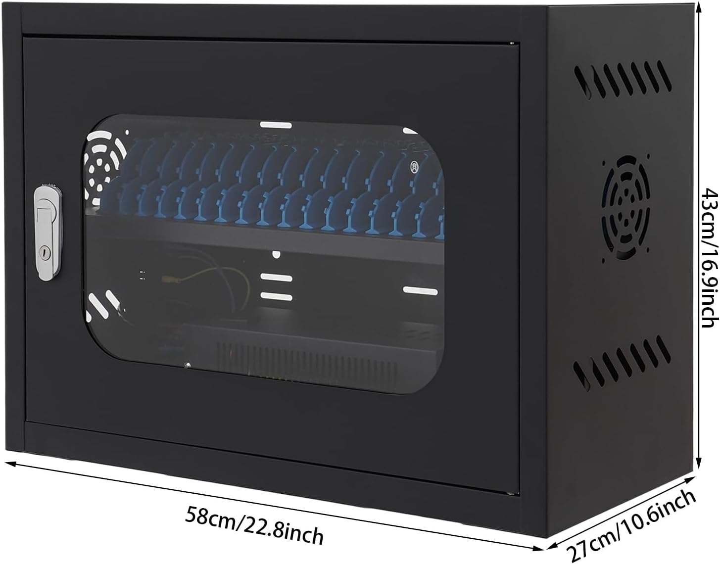 DescriptionThis charging cabinet for cellphones and tablets is a helpful tool in your life. It is mainly made of sturdy and durable cold-rolled steel, provides multiple safety protections, and efficiently provides sufficient power for your devices while ensuring safety of use, it is a good helper for your life and work.SpecificationsColor: BlackStyle: ModernShape: RectangularMaterial: Cold-rolled Steel, Tempered Glass, Hardware, ABS, CopperProcess: Plastic SprayingMounting Type: Wall Mount, TabletopPower Source: Corded ElectricPlug Type: US StandardWorking Voltage: AC10-130V, 50/60HZSingle Port Output Voltage: 5VSingle Port Output Current: 2A(Max.3A)Total Output Power: 200WCapacity: 20 DevicesWorking Temperature: -40 ~ 70℃/-40~158°FSuitable for Altitude: Below 2000m/6561.68ftProduct Size: 58x27x43cm/22.8x10.6x16.9inEach Compartment Size: 23x2.2x16cm/9.06x0.87x6.3inApplicable Phone/Tablet Computer Size: <8''Package Size: 63x48x33cm/24.8x18.9x12.99inGross Weight: 14kg/30.86 lbsNet Weight: 12kg/26.46 lbsPackage Included1x Charging Cabinet1x Power Cord2x Fuses2x Keys1x Chinese ManualNotes1. Please check the product size before ordering to make sure it fits your needs.2. Please note that you need to purchase additional expansion screws or other accessories to install the product on the wall.