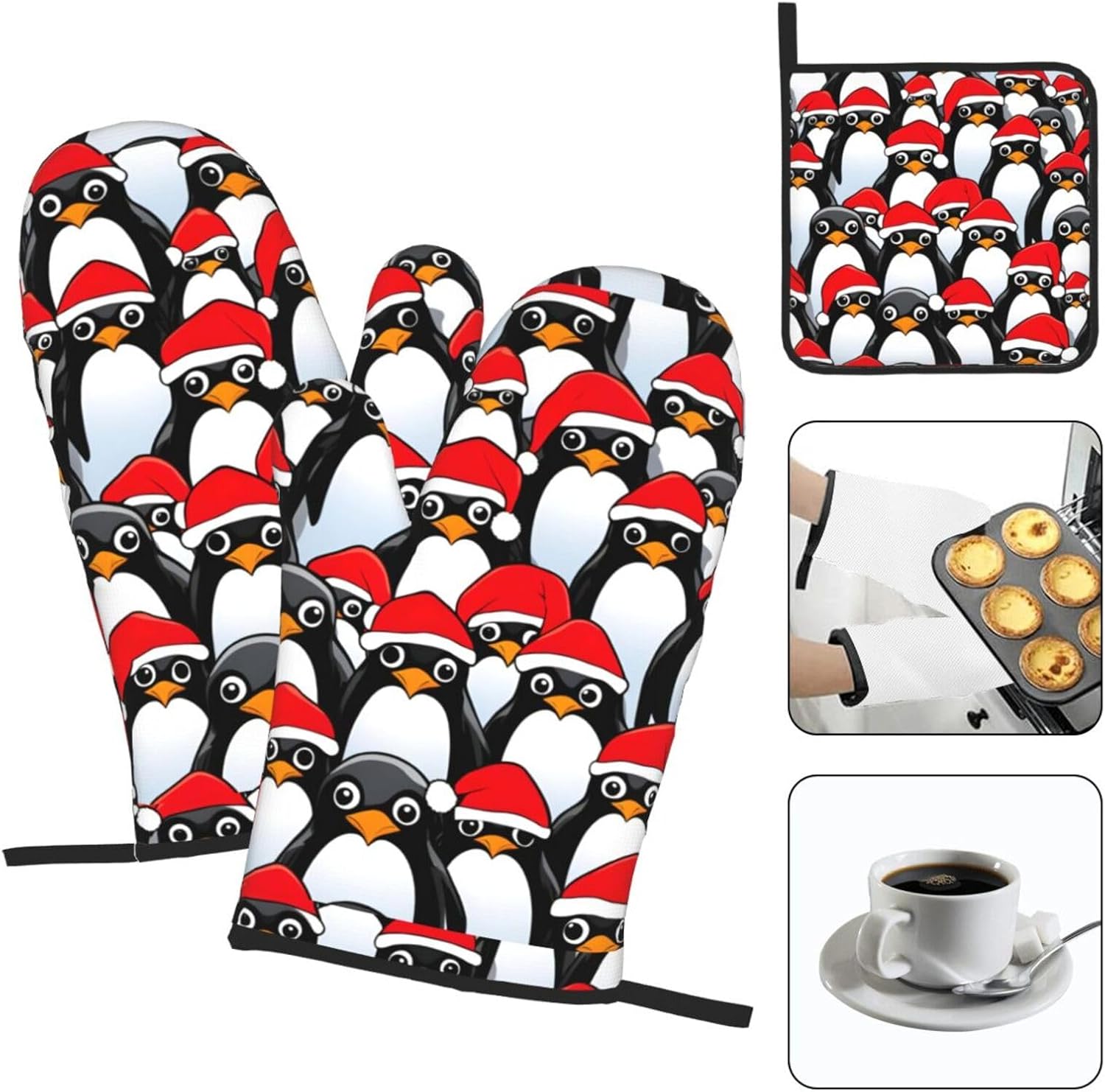upgrade your kitchen safety with this Christmas Penguins print microwave gloves, oven mitts and pot holders sets. crafted from water repellency polyester and heat-resistant fabric, these kitchen baking three piece set offers reliable protection for hands while handling hot items. the double-layer waterproof design ensures easy cleaning after use. suitable for various cooking scenarios including microwave ovens, conventional ovens, stovetop cooking, and outdoor grilling. the side hanging rope allows convenient storage when not in use. the thick construction provides excellent heat insulation without compromising dexterity. this unisex kitchen essential combines functionality with practical design for everyday cooking needs. the heat-resistant gloves maintain comfort while offering superior protection against burns. an essential addition to any modern kitchen setup