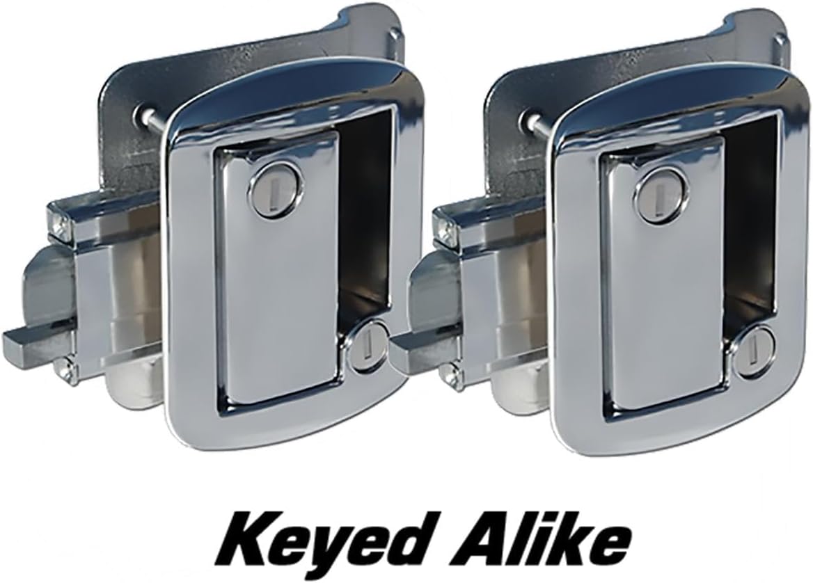 Upgrade your travel trailer's security with these genuine Global Link Travel Trailer Locks, featuring a super durable polished chrome finish. Designed as a direct replacement for the FIC 43610, Bauer, and Tri-Mark travel trailer locks, these high-quality locks provide a reliable and secure solution for your RV doors. Each lock comes with a rubber gasket attached to the outer part, ensuring a tight seal and preventing leaks. Key Features:Genuine Global Link Quality: Ensure you get the best with these brand-new, high-quality locks, avoiding cheap knock-offs.Polished Chrome Finish: Offers a sleek, modern look while providing durable protection against corrosion and wear.Rubber Gasket: Attached to the outer part of the lock that comes in contact with the door, ensuring a tight seal and preventing leaks.Keyed Alike: Both locks come keyed to the same Global Link key code for convenience. One key will open both locks, but each lock comes with two keys, totaling four keys.Compatibility: Direct replacement for FIC 43610, Bauer, and Tri-Mark travel trailer locksCut-Out Size: Fits hole cutouts from 2 1/2" x 3 1/2" to 3" x 4"Door Thickness Range: Compatible with doors ranging from 1 1/4" to 1 1/2" thick What's Included:2 Global Link Locks: Keyed alike for convenience.2 Keys per Lock: Total of 4 keys.1 Strike Plate per Lock: Ensures proper alignment and secure latching of the door.1 Door Edge Cover per Lock: Provides a clean and finished look to the installation.2 Door Edge Screws per Lock: Ensures the edge cover is securely attached.4 Mounting Screws per Lock: For secure attachment of the lock to the door. Applications:RV Entry Doors: Ideal for securing entry doors on travel trailers, providing peace of mind and enhanced security.Travel Trailers: Suitable for various travel trailer models, offering a reliable and durable locking solution.
