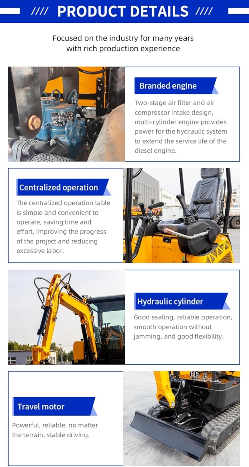 Product Name:Mini Hydraulic Excavator / Compact Crawler Digger Operating Weight: 0.8 Ton/1 Ton/1.2 Ton/1.6Ton/1.8Ton/2Ton/2.5Ton/3Ton/3.5Ton(Customizable) Engine Type:hydraulic or Alternative Power Options (Depending on Model) Key Applications: Landscaping Projects / Trenching Work / Farm and Agricultural Use Backyard Construction / Small Property Excavation / Earthmoving Tasks Urban Maintenance / Garden Renovation / Residential Utility Work Product Type: Mini Excavator / Compact Crawler Excavating Machine Small Hydraulic Digger for Construction and Landscaping Working Functions: Excavating / Trenching / Leveling / Ditch Cleaning / Earthmoving Grading and Light Demolition / Tree Planting and Root Digging Attachment Compatibility: Standard Bucket / Narrow Bucket / Rake / Ripper / Hydraulic Breaker Auger Drill / Grapple / Quick Hitch (Optional) Hydraulic System: High-Efficiency Hydraulic Pump / Stable Flow Control Optional Pilot or Mechanical Control System Chassis & Structure: Steel Track or Rubber Track Options Reinforced Boom and Arm / Heavy-Duty Structural Frame Operating Features: 360° Rotating Platform / Adjustable Joystick Controls Extended Boom Option / Foldable ROPS Canopy Optional Customization Options: Operating Weight Configurations / Track Types / Paint Color Attachments / Engine Type / Control System Warranty: 1 Year Quality Inspection: Full Testing Before Shipment Video Outgoing Inspection Provided (Machine Test Video Available) Machine Color: Customizable Color Options Documentation: Machinery Test Report Provided Operation Manual & Maintenance Guide Included