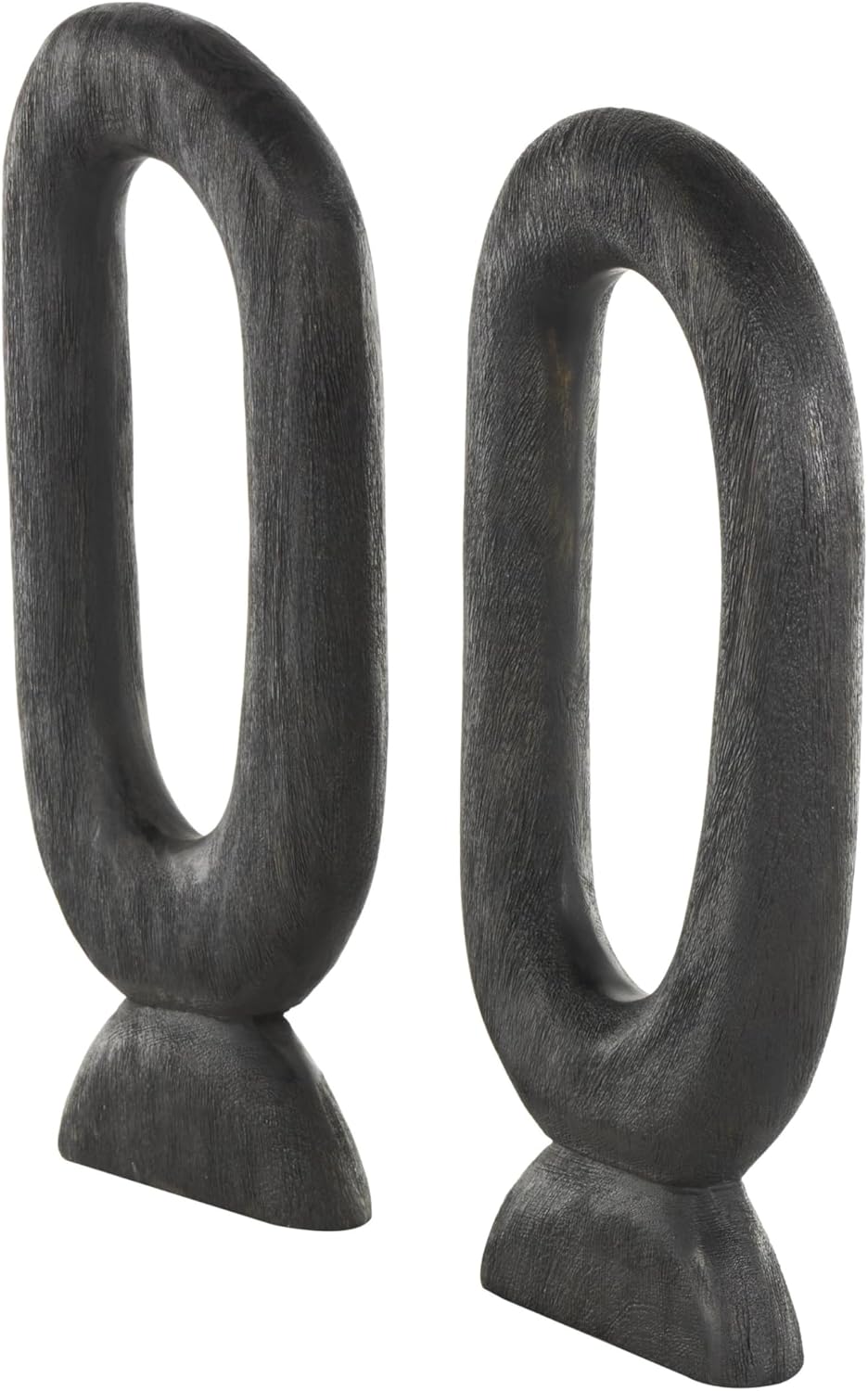 Natural sculptures in this set can be displayed together or separately on a tabletop or shelf, adding a unique artistic touch to your space. Designed with felt or rubber stoppers at the base that prevent scratching furniture and table tops, as well as sliding around. This item ships in 1 carton. Please note that this item is for decorative use only. Mango wood sculpture makes a great gift for any occasion. Suitable for indoor use only. This item ships fully assembled in one piece. Made in India. This black colored mango wood statue comes as a set of 2. Natural style.