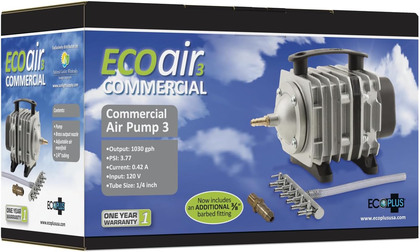 The EcoPlus® ECOair3 Commercial Grade Air Pump 1030 GPH is used to provide oxygen in aquariums and hydroponic systems. Its case is made of high-quality ZL 102 aluminum alloy with radiation fins to allow for more effective heat-dissipation. Driven by an electromagnetic motor, the EcoPlus® ECOair3 Commercial Grade Air Pump 1030 GPH adopts a straight-line reciprocal motion to produce air, and is more reasonable in structure. It also features wear-resistant material for the cylinder and piston, which is of lower consumption. This air pump has an oil-free, lubricated design, and distributes purified compressed air. Its constant temperature and pressure operation ensure reliable performance.