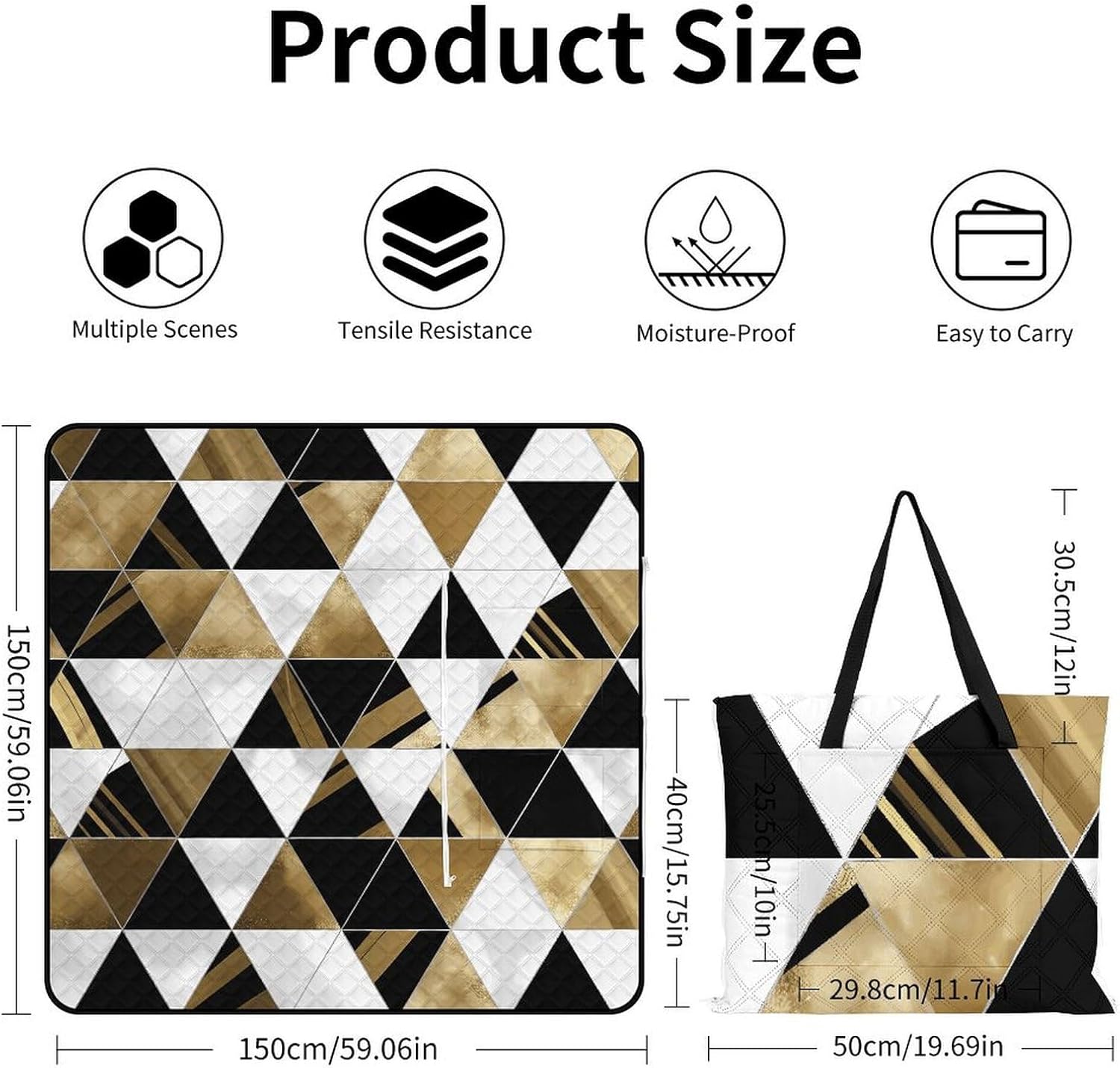 The picnic blanket ,we've only used the highest quality materials, so every picnic is an experience .The underside lining is very sturdy and therefore suitable for every surface. No more worrying about dirty or wet bottoms when you are sitting on damp grass. The Fashion Modern Black White Gold Triangles blanket protects you from water, dust and dirt.A large capacity bag and a picnic blanket, 2in1. It has a large capacity and one bag can hold everything you need for going out. You choose the place you want to lie down, and this bag can be turned into a comfortable picnic blanket in seconds also it can fold into tote bag, which is waterproof, sand-proof and wear-resistant.Therefor,you can take it to nearby parks, campuses, beaches or lawn, anywhere you want to lie down.