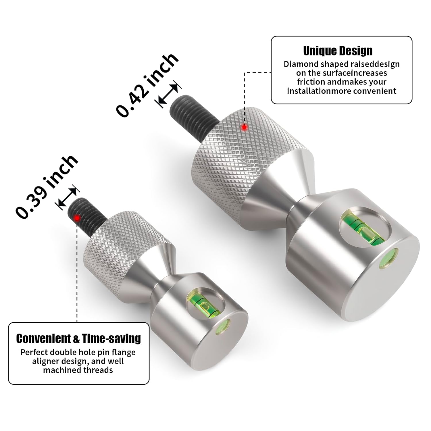 Specifications: Material: High-Quality Stainless Steel for superior strength and corrosion resistance. Size: 1-5/8”&1-1/8" pin diameter, designed to fit a wide range of standard holes. Design: Detachable flange Special Feature: Integrated bubble level for real-time alignment monitoring. Features & Benefits Rapid Setup & Tear-down: The quick-release, detachable design significantly speeds up your workflow, saving valuable time on repetitive tasks. Guaranteed Perfect Alignment: The built-in bubble level provides instant visual feedback, ensuring your jigs, fixtures, and assemblies are perfectly level for professional results every time. Exceptional Durability: Crafted from Stainless Steel, these pins offer superior resistance to bending, wear, and deformation, guaranteeing long-term reliability in demanding environments. Unshakable Stability: The wide two-hole flange base secures firmly to your work surface, effectively preventing any movement, shifting, or wobble during critical operations. Broad Compatibility: The versatile 1-5/8" &1-1/8" size accommodates numerous standard hole specifications, making it an ideal, multi-purpose tool for woodworking, welding, and assembly projects. Enhanced Productivity: By simplifying the alignment process and reducing setup time, these pins help you complete projects faster and with greater consistency. Cost-Effective Solution: The robust construction ensures a long service life, providing excellent value and reducing the need for frequent replacements. Package Includes 4 PCS × Flange Two Hole Alignment Pins