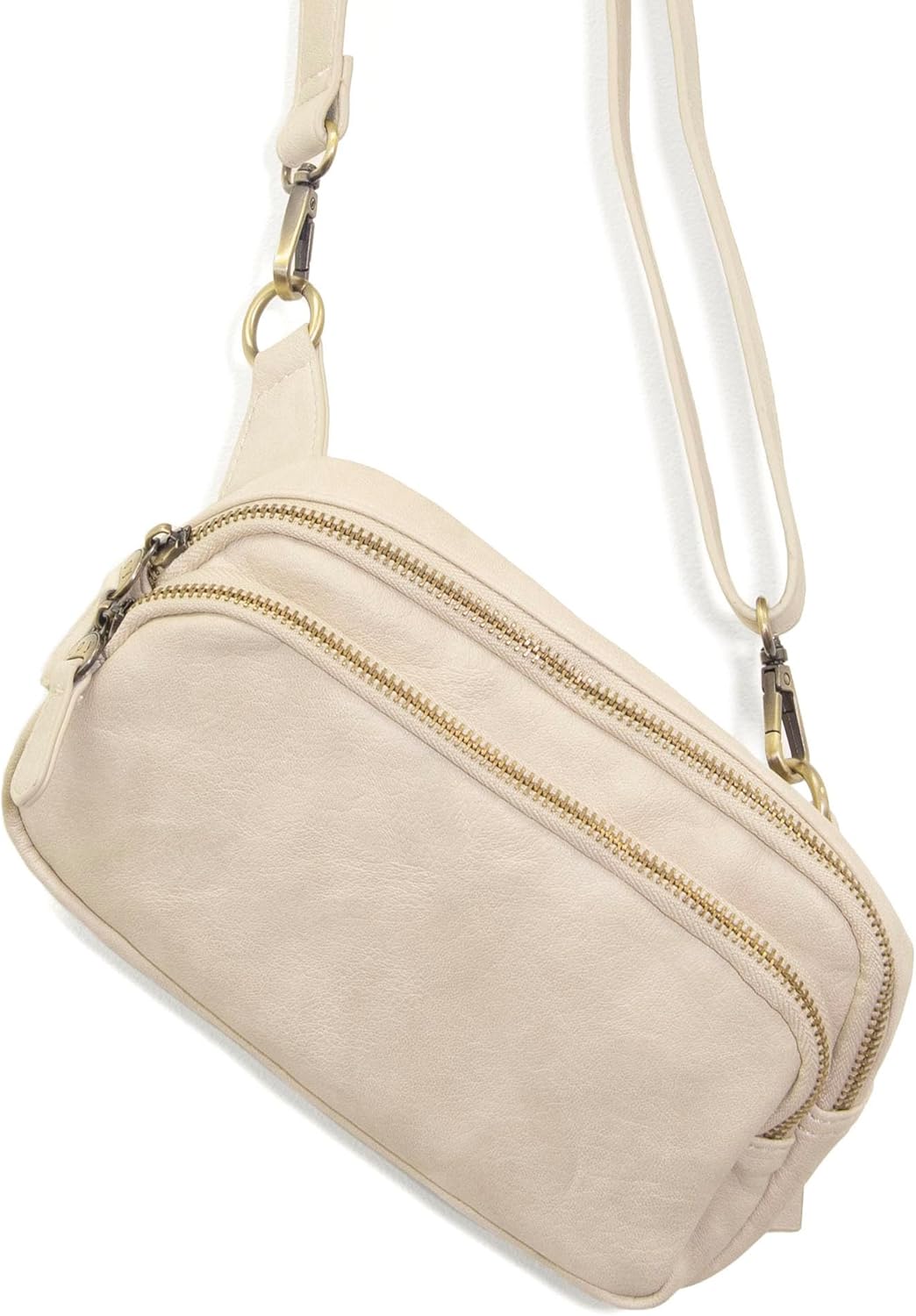 Joy Susan Kylie Double Zip Sling Belt Bag. This versatile accessory allows you to choose between sling and belt bag wear, adapting to your preferences. Practicality meets style with its compact yet functional design. The top zip closure and front zip pocket provide ample space for essentials like your phone, a small wallet, and other daily necessities. Whether you're heading out for a jog, running errands, or simply embracing the athleisure trend, this bag is designed to keep your items secure and easily accessible. Crafted in super-soft tumbled vegan leather, the Kylie bag adds a casual yet chic element to your ensemble. The gleaming metal zippers and signature Joy Susan logo zip pulls add a touch of sophistication to its overall look. Inside, you'll find a well-thought-out interior with one zip closure pocket and one slide pocket. These features help you stay organized, ensuring that your belongings are in order and easy to access. Choose the Kylie Double Zip Sling Belt Bag for its versatility, style, and practicality. Whether worn as a sling or belt bag, it's a fashionable addition to your athleisure wardrobe. Upgrade your look with this compact and versatile bag that combines casual chic with functionality, making it an ideal choice for those who appreciate both style and convenience.
