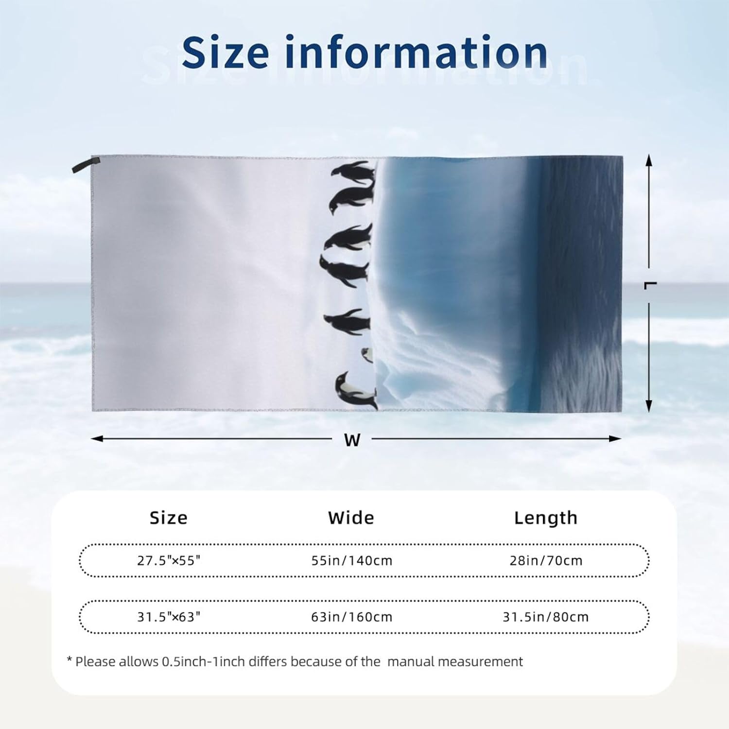 designIceberg Penguins compact towel for camping are designed with one-sided printing. The towels are equipped with special packaging bags and carabiners, which are convenient for packaging and hanging, and can be hung anywhere to dry quicklymaterialcompact towels for swimming is made of microfiber, which is more absorbent than standard towels, dries quickly, is lightweight, and small enough to easily fit the towel into a gym bag or backpackscene cotton towel for beach carabiner on the bag, can be attached or packed into your bag, the beach towel can also be used as a sports towel, travel towel, yoga towel or used as a beach, bathing, swimming pool, swimming, boating, sunbathing, mats for spa, sauna, water park, climbing, fitness, yoga, travel, camping, hiking, picnic, travel, outdoor and sports, etccomponentbeach blanket for swimming have buckle webbing, easy to hang and air dry, pvc packaging bag, equipped with a carabiner, easy to store and carrywashinglightweight towel for swimming machine washable, wash before first use, just hand wash or machine wash, air dry