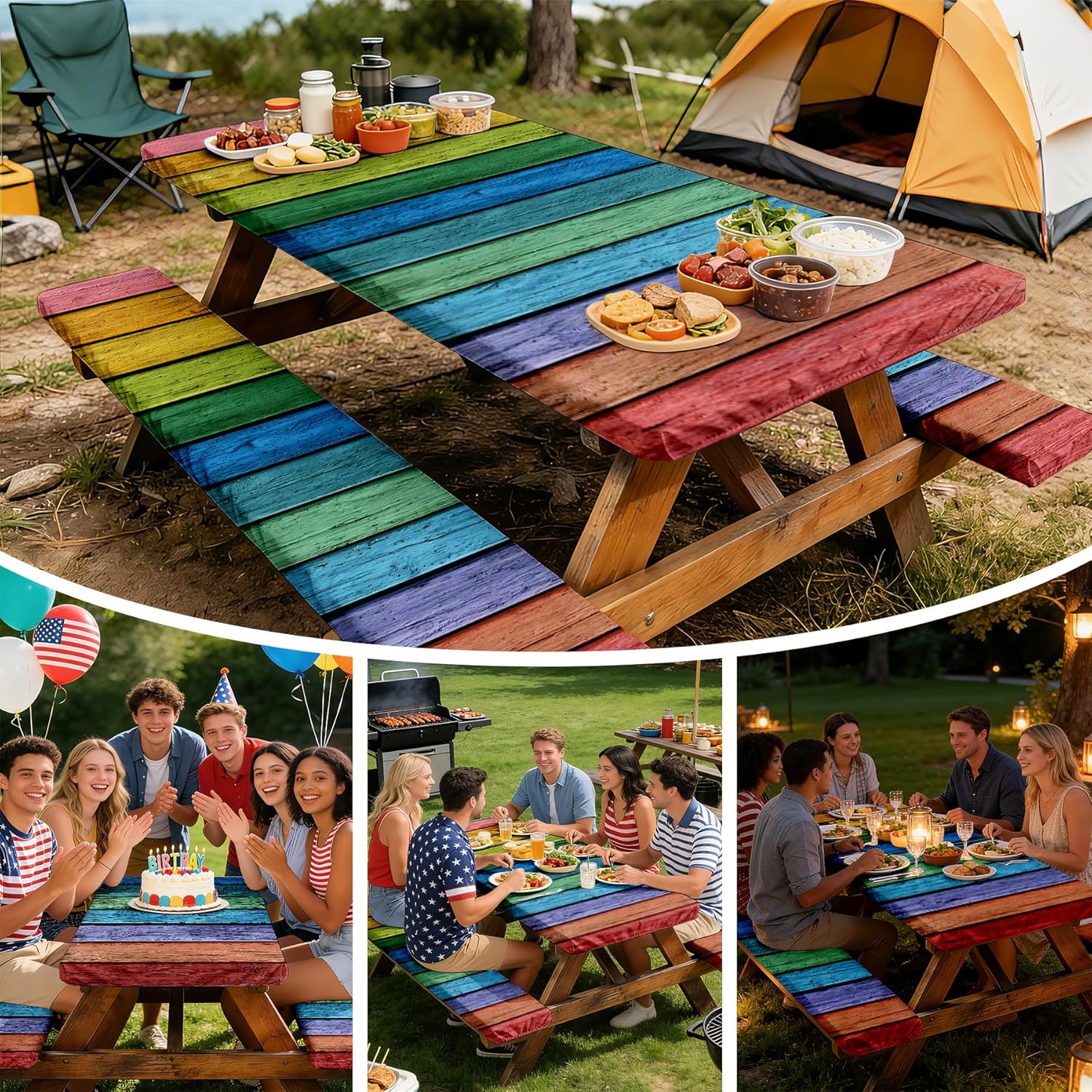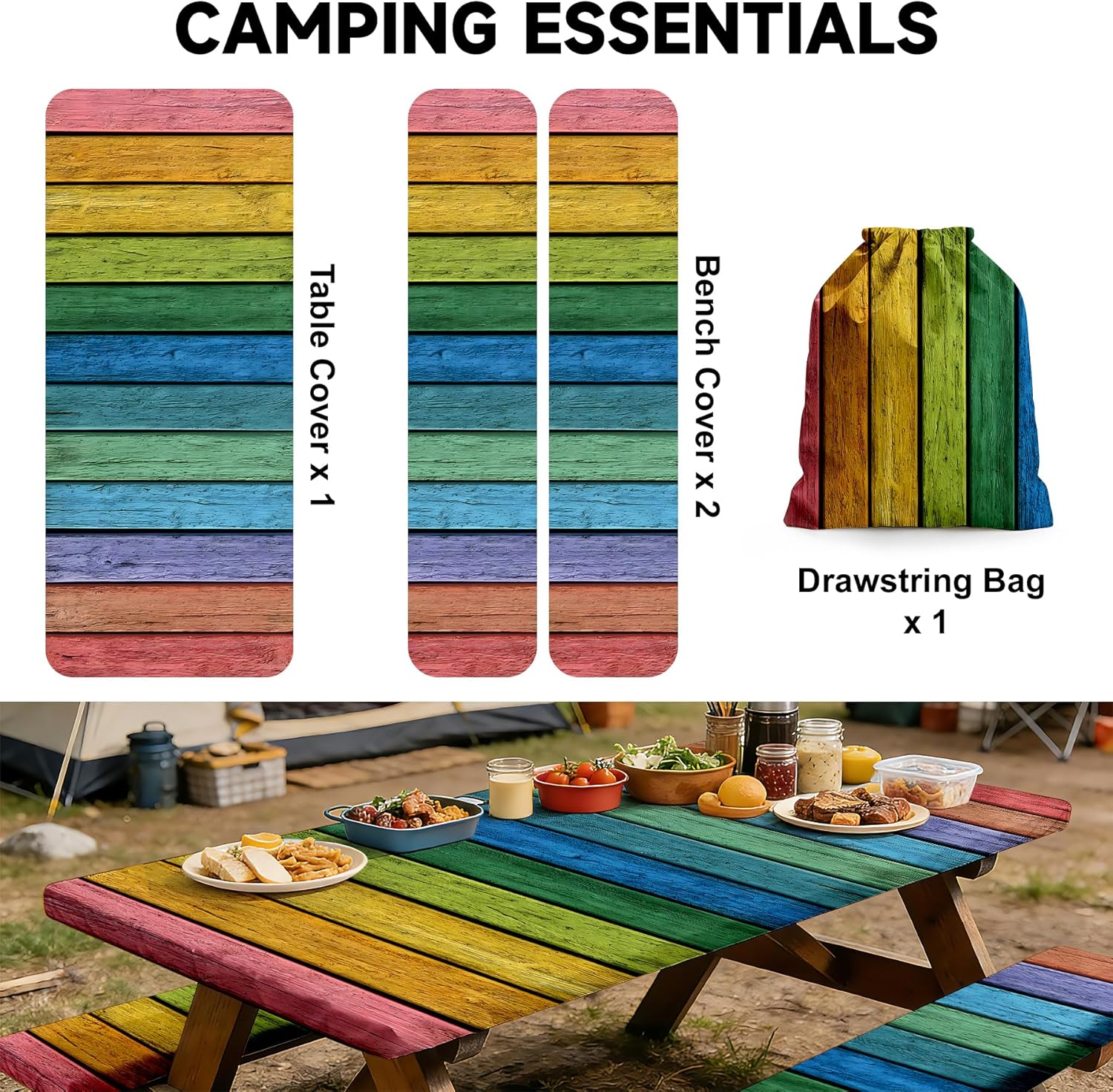 Features:1. This 3-piece set combines durability, convenience, and versatility to become your new favorite Camping Essentials. No need to buy separate covers, saving you time and money while keeping your outdoor seating clean and protected.2. The tablecloth cover with elastic edge is engineered for a secure, hassle-free fit. The elastic hem wraps tightly around the edges of your table and benches, eliminating the frustration of loose covers that slip, bunch, or blow away in the wind.3. Portability is key for outdoor gear, and this set delivers with its included Tablecloth with Drawstring Bag. When the party’s over, simply fold the tablecloth and bench covers, tuck them into the compact drawstring bag, and stow them in your camping gear, car trunk, or picnic basket.4. It’s lightweight enough to carry anywhere, making it perfect for camping trips, beach days, park picnics, tailgates, and even backyard BBQs or patio parties.5. More than just a practical accessory, this tablecloth set adds a touch of style to any outdoor setting. Its classic design complements any decor, from casual camping trips to more polished patio gatherings. Specifications:Material: PolyesterSize: tablecloth cover: 72*30in/183*76cm, bench covers: 72*12in/183*30.5cmColor: As picture shownNote:1.Due to differences in computer monitors and lighting effects, the product color may vary slightly.2.Due to different manual measurements, there may be slight errors in product size. Please refer to the actual product received.