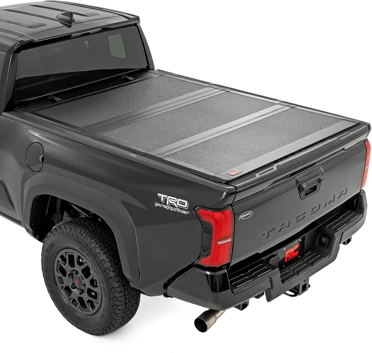 Elevate your Tacoma's functionality and appearance with Rough Country's fourth-generation Tacoma Hard Tri-fold Flip-up Bed Cover. Unlike traditional bed covers that limit access to your truck bed, our innovative Flip-up design grants you complete access to your truck bed, making it easier to load and unload large items.Full-Bed Access: With Rough Country's Tri-fold Flip-up Bed Cover, you can conveniently flip up the cover, allowing full-bed access without the hassle of removing the cover.Built to Last: Our bed cover is crafted from lightweight aluminum and boasts a resilient powder coat finish. This coating resists corrosion and wear, ensuring that your truck bed maintains its pristine appearance even in harsh weather conditions.Superior Water Drainage System: The bed rails of this bed cover feature an innovative water drainage system. No need to worry about water pooling on your cover or seeping into your truck bed.Premium Weather Seals: The Tri-fold cover also includes top-of-the-line weather-resistant seals that create a tight and secure barrier along the bed rails. These seals ensure your cargo remains protected from the elements, even in inclement weather.Secure Cargo Storage: Provide added security for your truck bed contents, deterring theft and protecting valuable items.Constructed from a lightweight aluminum panel with a sturdy aluminum frame, this hard tri-fold cover features a textured black powder coat finish, a secure tailgate locking system, and a reliable slide lock latching mechanism. Fits models with utility rail system. Models equipped with a factory bed storage box found as a part of Toyota's Trail Special Edition may experience clearance issues resulting in the storage box needing to be removed.
