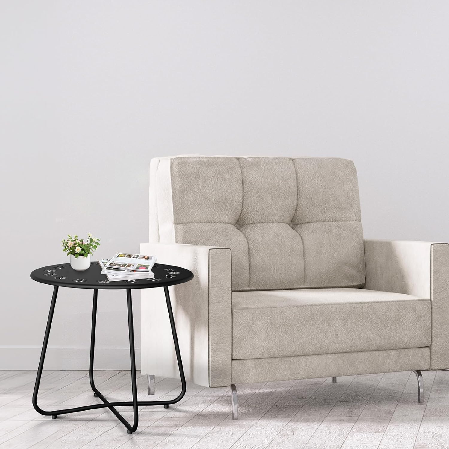 Introductions:Bring charm and functionality to your outdoor space with this Weather Resistant Steel Patio Side Table. Featuring delicate flower cutouts along the edges, this round table is not only aesthetically pleasing but also practical, with a design that prevents standing water and resists rust. Made from durable, powder-coated steel, it is perfect for withstanding outdoor conditions while adding a contemporary touch to your patio, yard, or balcony. Whether you're enjoying a cup of coffee or showcasing your favorite plant, this versatile table complements any space.Features:1. Elegant Design with Functional Details: Highlighted by charming flower cutouts, this outdoor side table adds a touch of sophistication to your décor while ensuring water drains effectively to avoid standing water and rust.2. Durable Construction for All Weather Use: Made with high-quality powder-coated steel, this table is resistant to peeling, rust, and rot, making it ideal for outdoor use in any season.3. Adjustable Feet for Stability: Equipped with four adjustable protective feet, this table can be leveled on uneven surfaces for added stability while preventing scratches on your floors when moved.4. Versatile Applications: Perfect as a garden table, bedroom nightstand, or living room end table, it fits seamlessly into a variety of settings. Use it next to a sofa, camping chair, bed, or as a stylish accent in a corner.5. Easy to Assemble: Quick and hassle-free assembly with all necessary hardware and clear instructions, allowing you to set it up in just a few simple steps and start enjoying your new side table right away.Specifications:1. Material: Iron2. Color: Black3. Overall Dimensions: (20.1 x 20.1 x 17.7) in / (51 x 51 x 45) cm4. Net Weight: 4.2 lbs / 1.9 kgPackage Includes:1 x Outdoor Side Table1 x Hardware Kit