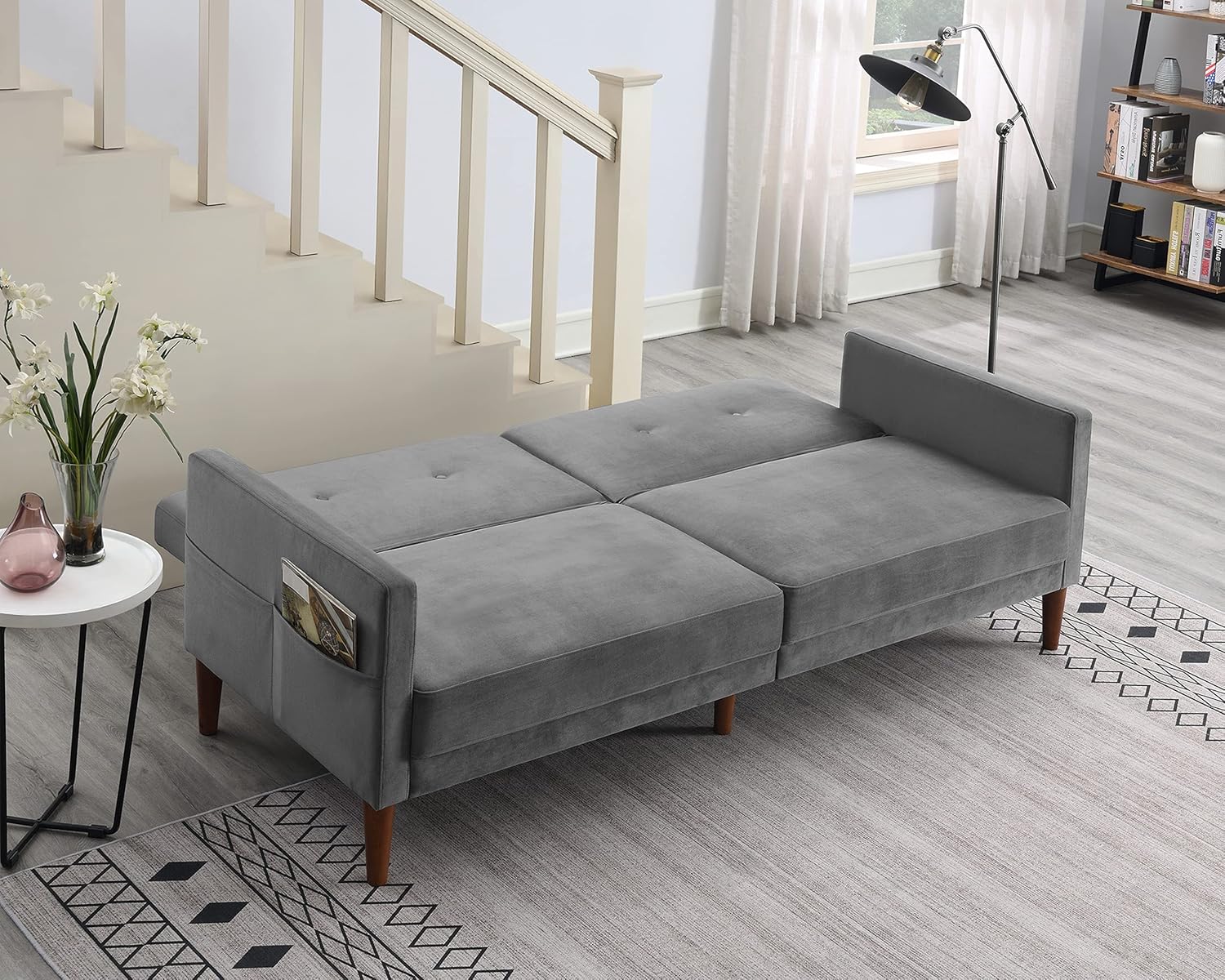 Don't lost style in your small rooms or compact spaces! This 76 inch small couch adds charm to your small apartment, dorm, living rooms or loft while its streamlined silhouette arms fuse together to make a modern look.3 adjustable positions can offer different comfort to you, if you want to watch TV in your living room you can adjust the back rest to 110° or 140 °, if you want to take a nap you can adjust the angle to 180 ° as a bed.Side pocket design to keep small items within reach such as books, magazines, tablet, etc. Strong wood frame wrapped by supportive foam and durable velvet fabric, this loveseat couch offer a great support with weight capacity of 400 lbs.▲Product DetailsWeight & DimensionsOverall Dimension: 76.3" (L) * 32.7" (W) *32.3" (H)Detail Dimension: Please refer to the imagePackage Dimension: 36" (L) * 25" (W) *21" (H)Package Weight (lb): 90.39Product Weight (lb): 78.26Weight Capacity: 400 lbs (181.44 kg)Assembly Required: About 45 Minutes▲SpecificationsUpholstery Material: VelvetFrame Material: PlywoodSeat Construction: Sinuous Springs+SpongeLeg Material: WoodRemovable Backrest: NoRemovable Backrest Cover: NoRemovable Cushion: NoRemovable Cushion Cover: NoSet Includes: Loveseat