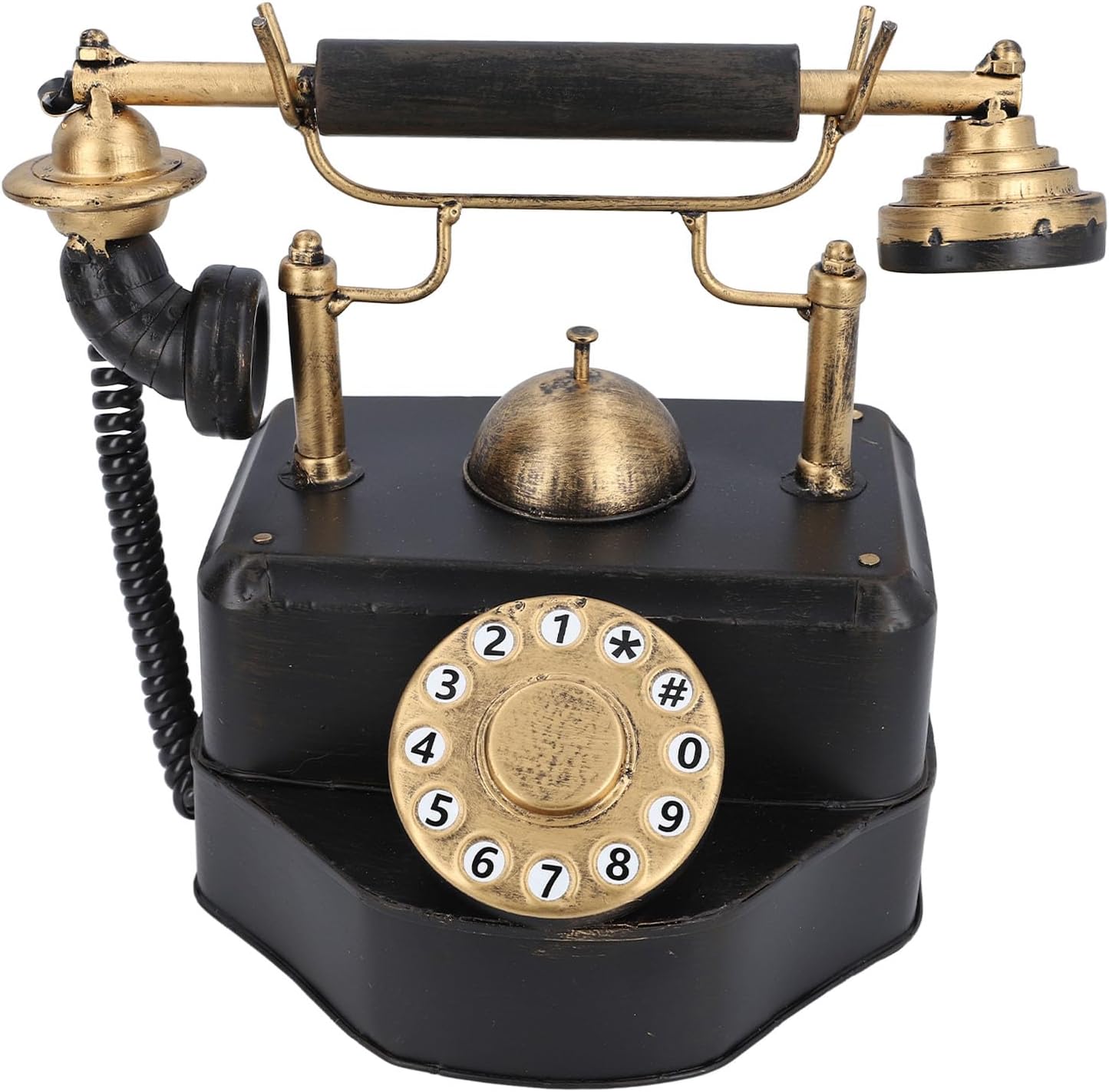 1. Vintage Design: This model boasts a nostalgic, antique telephone design that is exquisitely crafted to resemble the real thing. Even though it's not a functional phone, the attention to detail make it a unique decorative centerpiece. 2. Iron Material: Crafted from premium iron that is both sturdy and , this antique phone model promises a long lifespan of use. It's a testament to excellent craftsmanship that balances functionality and design. 3. Versatile Decor: With its striking appearance, this retro phone model serves as the piece of decor for various settings. It's an ideal addition to a home, coffee shop, bar, or even to be used as a movie prop, lending a distinct character to your space. 4. Gift Option: For those who appreciate a hint of whimsy or have a penchant for collecting antiques, this vintage rotating telephone makes the gift. Be it friends, colleagues, teachers, or the elderly, it's sure to delight the receiver with its charm and intricate detailing. 5. Unique Individuality Representation: As a decorative piece, our antique phone model helps and enhance your unique style and individuality. Whether used in a commercial setting or home, it's sure to offer a touch of sophistication and nostalgia. Spec: Item Type: Antique Phone Model Material: Iron Weight: Approx. 856g/30.2oz Product Size: Approx. 28x22x17.5cm/11.02x8.66x6.89in Package List: 1 x Antique Phone Model