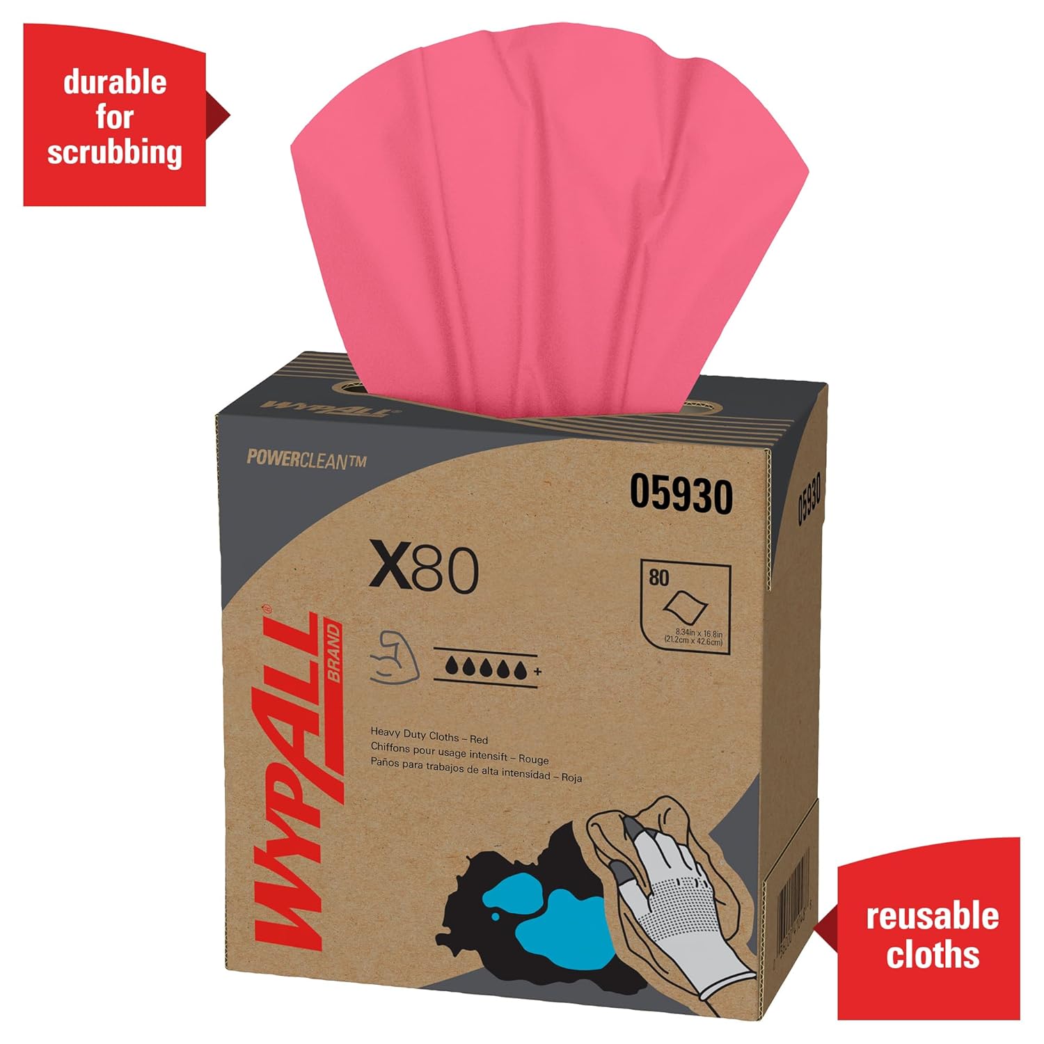 Whether you’re cleaning up grease or soaking up spills, it pays to use the best supplies. Trust the WypAll Brand, the one that sets the standard for excellence in cloths. WypAll X80 Extended Use Cloths feature innovations like high-tech HydroKnit fast-absorbing material and are durable for scrubbing. These contaminant-free commercial cloths are a favorite replacement for industrial cloth towels, which can harbor dangerous chemicals, such as lead (In a 2003 Gradient study, 100% of the sampled laundered shop towels tested, lead was detected at levels that may exceed health based exposure guidelines.). WypAll X80 are made of soft pulp fibers, bonded to a polypropylene base sheet for absorbency and durability, making them suitable for removing dirt, oil, grime and solvents in industrial and manufacturing businesses. The reusable cloths are reinforced for strength when wet and dry. These bulk cloths are a great alternative – safer and more efficient – to replace laundered rental shop towels or and cleaning towels. Use them for heavy duty machine- and part-wiping, wiping metal shavings, prepping surfaces with solvents and cleaning rough surfaces. After all, every business gets dirty. But for the toughest grease and grime, you can trust Wypall X80 Cloths.