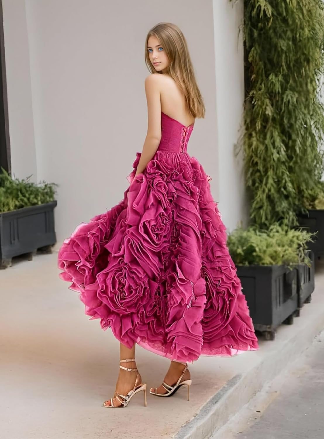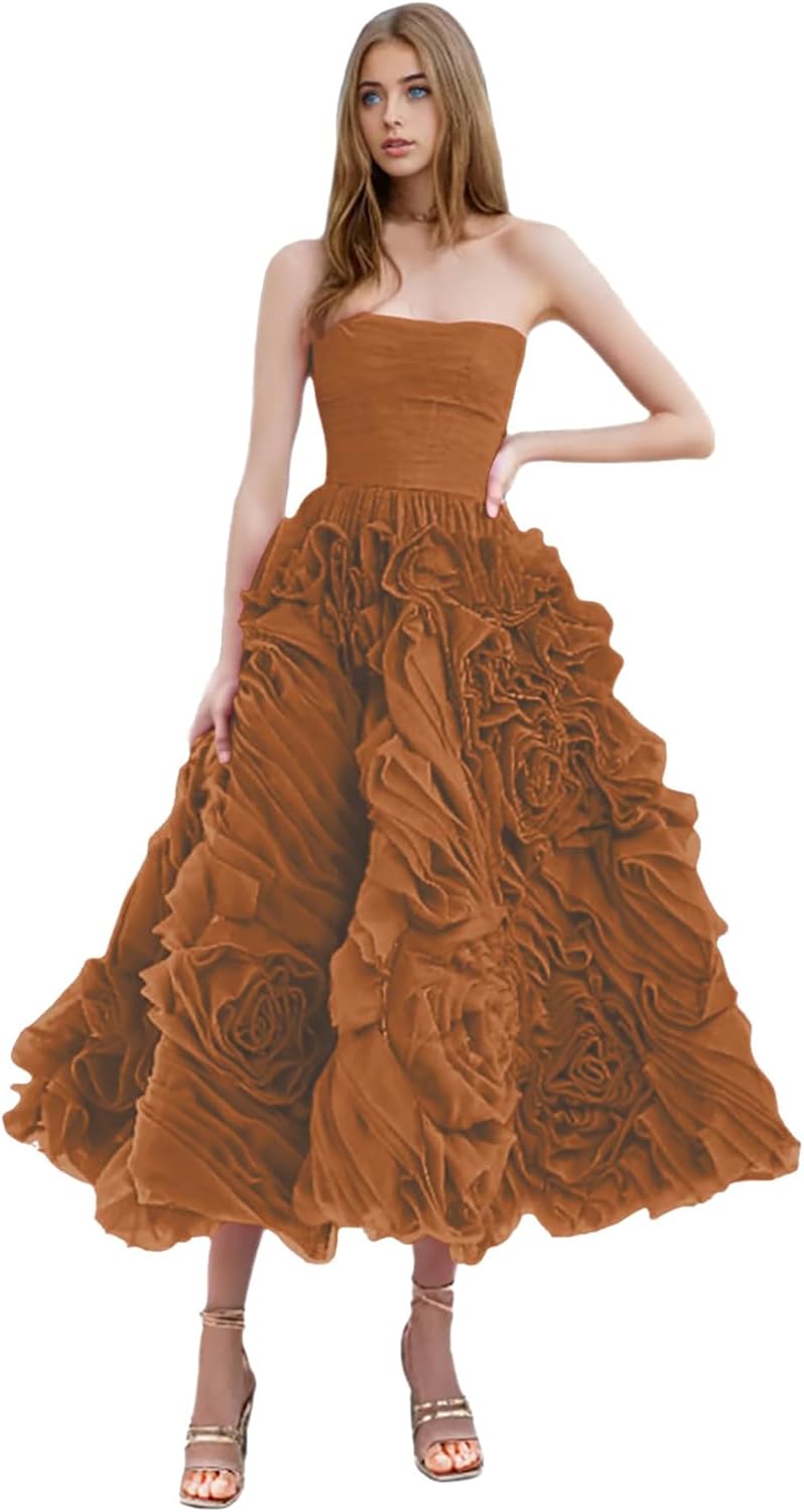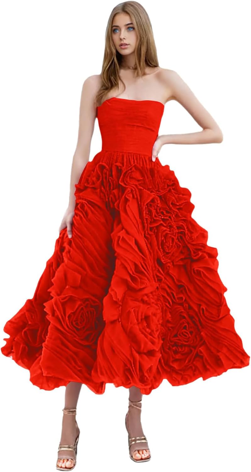 Make a stunning entrance in this breathtaking tea-length evening dress. The strapless design features a fitted bodice that gracefully transitions into a show-stopping skirt adorned with dramatic, dimensional ruffles in a vibrant hue. The artfully crafted ruffles create an enchanting sculptural effect that adds movement and drama to every step. It is ideal for formal occasions, cocktail parties, or special events.