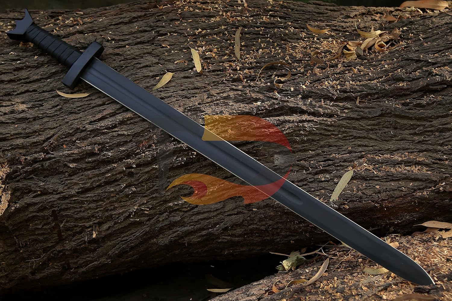 Handcrafted Hardened Steel Viking Sword (Dark Version) With Calfskin Cover | Utilitarian Sword | Fight Prepared Blade Depiction: This sword configuration was propelled by the Middle age, Viking, and Roman Blades that steered history. We concluded that going with a mixture would be a decision of plan since it would devote magnificence to all. This is the dark form of the sword. Complete Length of the Sword: ~36 inches Sharp edge Length: ~29 inches Handle Length: ~ 7 inches The sharp edge has been powder covered Dark Calfskin Handle is folded over on the handle to give upgraded grasp Accompanies a Dark Calfskin sheath redid to convey or store the blade The best of hardened steel was utilized in the making of this sword. This sword is utilitarian and can be utilized as fight prepared.